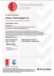 Lifeloc designed and manufactures the Lifeguard FC20 breathalyser in the USA. Lifeloc breathalysers are now AS3547 certified.