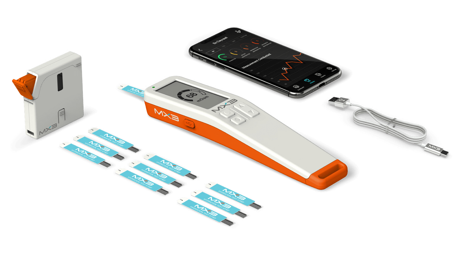 With this dehydration tester, hydration measurements are viewed in real time directly on the MX3 LAB or App and uploaded wirelessly to the MX3 Pro Portal for a more detailed analysis.